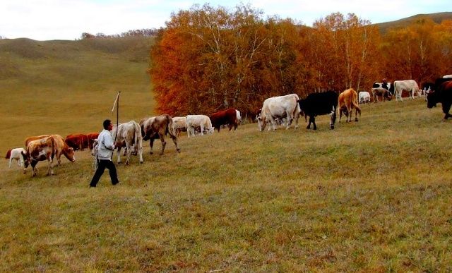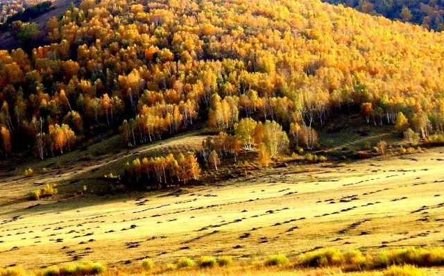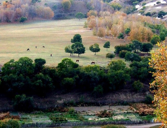 秋天的草原就像色彩斑斕的大地毯,成片的牛群、羊群、馬群點(diǎn)綴其間,其情其景,美不勝收。那時(shí)我深感我的相機(jī)檔次太低,無(wú)法捕捉到遠(yuǎn)距離的清晰鏡頭??纯瓷磉叺臄z影愛好者們都是“長(zhǎng)槍短炮”,有的人甚至抱著兩三個(gè)專業(yè)相機(jī),好羨慕啊!好在自己安慰自己,我只是個(gè)業(yè)余攝影愛好者,能拍幾張草原的大全景就很知足啦。所以,每當(dāng)發(fā)現(xiàn)一個(gè)好景致,我往往會(huì)興奮地告訴身邊的人,和大家同享;每拍到一張好的片子,我心里就別提多高興了。