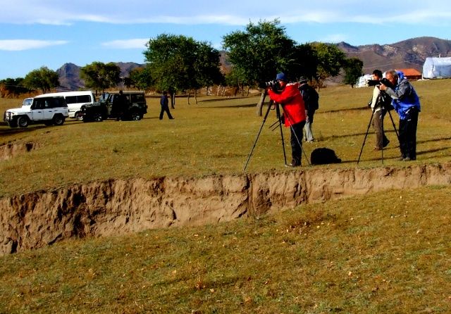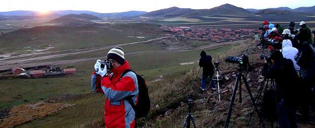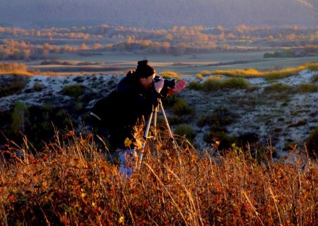 剛到壩上那天,我好興奮啊,可是一天下來(lái),就體會(huì)到這趟旅游的辛苦了。因?yàn)槊刻煸缟?點(diǎn)就起床,4點(diǎn)半出發(fā)。那時(shí)天還沒亮,我裹著大衣坐在車上遠(yuǎn)遠(yuǎn)望去,只見漆黑一片的曠野上,全是吉普車星星點(diǎn)點(diǎn)的燈光,像一條彎彎曲曲的長(zhǎng)龍?jiān)谇靶?,很是壯觀。為了拍到日出的鏡頭,每天早上我都與愛好攝影的人們驅(qū)車到不同的景點(diǎn)。一下車,我就背著攝影器材,頂著凜冽的寒風(fēng),氣喘吁吁地爬到山頂上。可是有許多次,因?yàn)榍趭^的攝影人太多,最佳位置已經(jīng)沒有了,要想找到一個(gè)合適的地方支三角架,相當(dāng)?shù)牟蝗菀住?/div>