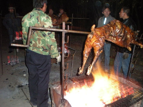 烤全羊也很名副其實(shí),確實(shí)是一整只羊在火上烤